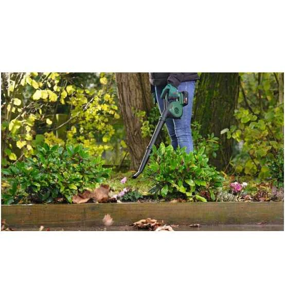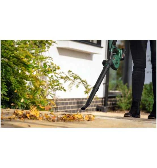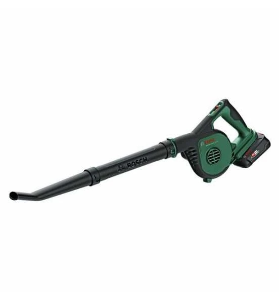 Akku-Laubbläser UniversalLeafBlower 18V-130. Leichter Akku-Laubbläser für schnelles und leichtes Säubern im Außenbereich. Beseitigt mühelos Laub und kleinere Schmutzteile von kleinen bis mittelgroßen Flächen. Leicht und kompakt: wiegt nur 1,6 kg und verfügt über einen bequemen, ergonomischen Griff. Leichte Bedienung mit 2 Geschwindigkeitsstufen für vielseitiges Säubern. Schnell und kraftvoll mit einer Luftstromgeschwindigkeit von bis zu 245 km/h. Syneon Technology für optimale Kraft und Ausdauer nach Bedarf. Kompatibel mit Bosch 18V POWER FOR ALL-Akku. 1 x Akku PBA 18V 2.5Ah; Ladegerät AL 18V-20; Kartonschachtel