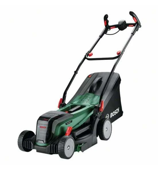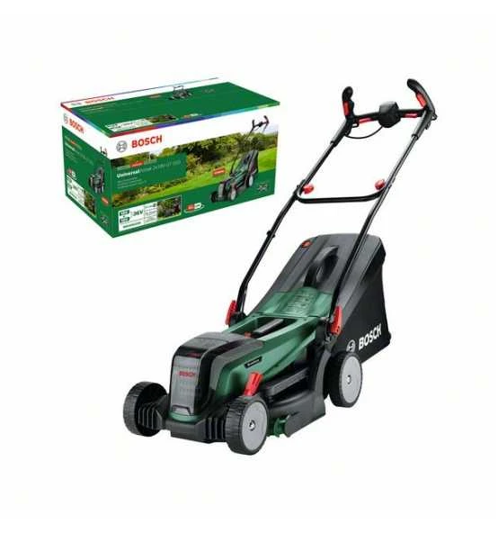 Akku-Rasenmäher UniversalRotak 2x18V-37-550. Kraftvolles Mähen und bequeme Grasschnittsammlung für mittelgroße bis größere Rasenflächen. Kraftvolles Mähen dank bürstenlosem Motor und 36V-Elektronik (2 x 18 V). Saubere Rasenflächen dank hochwertigem Textilgrasfangskorb mit Anzeige bei vollständiger Füllung. Ideal zum Mähen mittelgroßer bis größerer Rasenflächen mit langem oder kurzem Gras. Starke 36-Volt-Leistung von zwei 18V-Akkus, Syneon Technology für optimale Kraft und maximale Laufzeit. Kompatibel mit Bosch 18V POWER FOR ALL-Akku. Grasbeutel 40 l mit Anzeige bei vollem Beutel. Karton