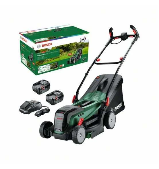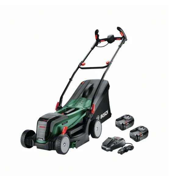 Akku-Rasenmäher UniversalRotak 2x18V-37-550. Kraftvolles Mähen und bequeme Grasschnittsammlung für mittelgroße bis größere Rasenflächen. Kraftvolles Mähen dank bürstenlosem Motor und 36V-Elektronik (2 x 18 V). Saubere Rasenflächen dank hochwertigem Textilgrasfangskorb mit Anzeige bei vollständiger Füllung. Ideal zum Mähen mittelgroßer bis größerer Rasenflächen mit langem oder kurzem Gras. Starke 36-Volt-Leistung von zwei 18V-Akkus. Syneon Technology für optimale Kraft und maximale Laufzeit. Kompatibel mit Bosch 18V POWER FOR ALL-Akku; 2 x Akku PBA 18V 4.0Ah; Ladegerät AL 1830 CV; Grasbeutel 40 l mit Anzeige bei vollem Beutel; Karton