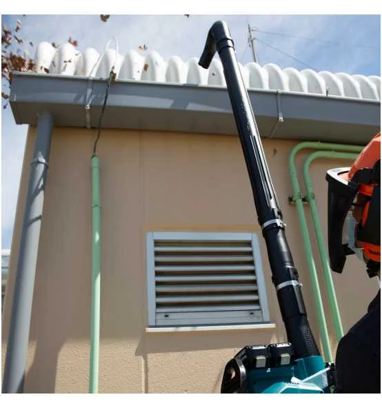 Einfache Dachrinnenreinigung mittels Laubbläser und Dachrinnen-Reinigungsset